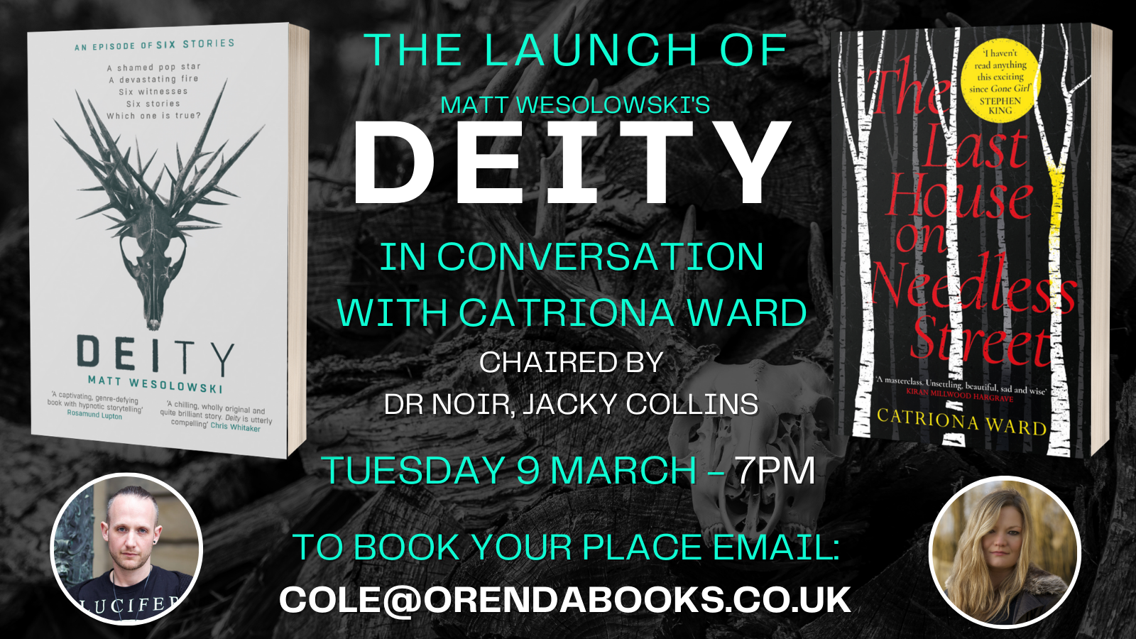 This event is free to attend, however we do encourage you to support the authors in any way you can and Deity and The Last House on Needless Street are available to order online now. Signed copies of both books are available EXCLUSIVELY from our partner bookshop, Forum Books: HERE